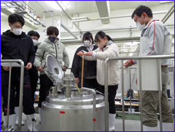 3年生を対象とした実習で、麦100%を用いての製造です。実習はプラントの洗浄から始まり、プラント上に多数配置されているバルブおよびポンプの操作による製品の加熱、ろ過、冷却、原料である麦芽の糖化のために酵素をうまく機能させるための温度管理、さらには製品に含まれるエキス分の濃度測定による発酵状態の確認など多岐にわたる操作を行うことで、ものづくりにおけるバイオ資源利用、工業プロセスの扱いを実際に体験する実習で、食品衛生管理の考え方も学びます。